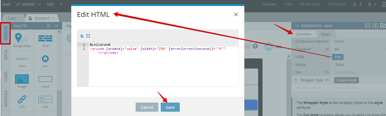 - We will use a custom Angular component, so we need to add the following code to the HTML component that we created on Screen1. In the page DESIGN panel, select the component and click the Edit button for the HTML property located under the Common tab. In the HTML editor that opens, add the following code and save: