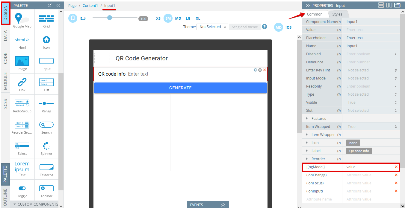 - Also, we need to add the value variable for the Common >[(ngModel)] property of the Input component: