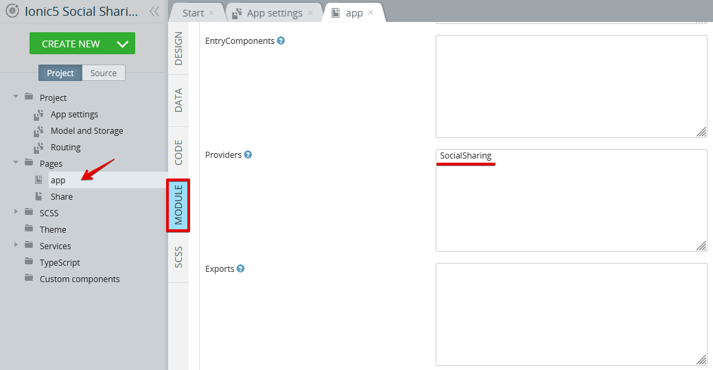 - Then, scroll down to the NgModule Settings > Providers section and type SocialSharing into the text field: