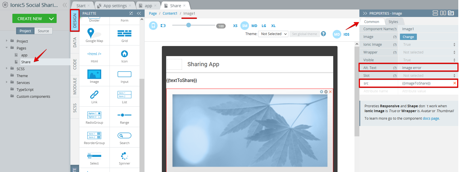 - Create a new Image element and under the Common tab, set its src property to {{imageToShare}}. Alt. Text is set to Image error: